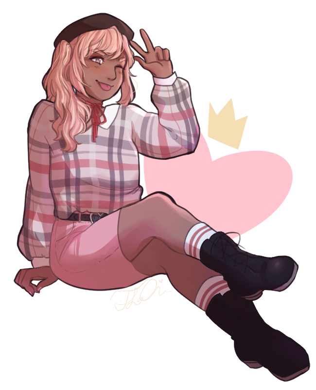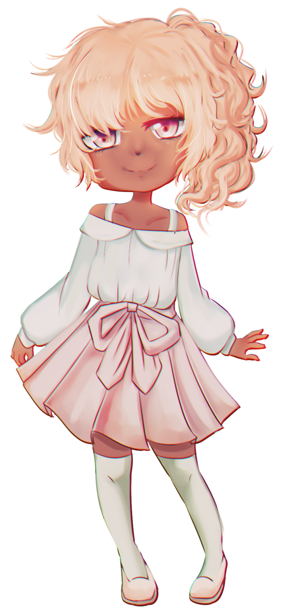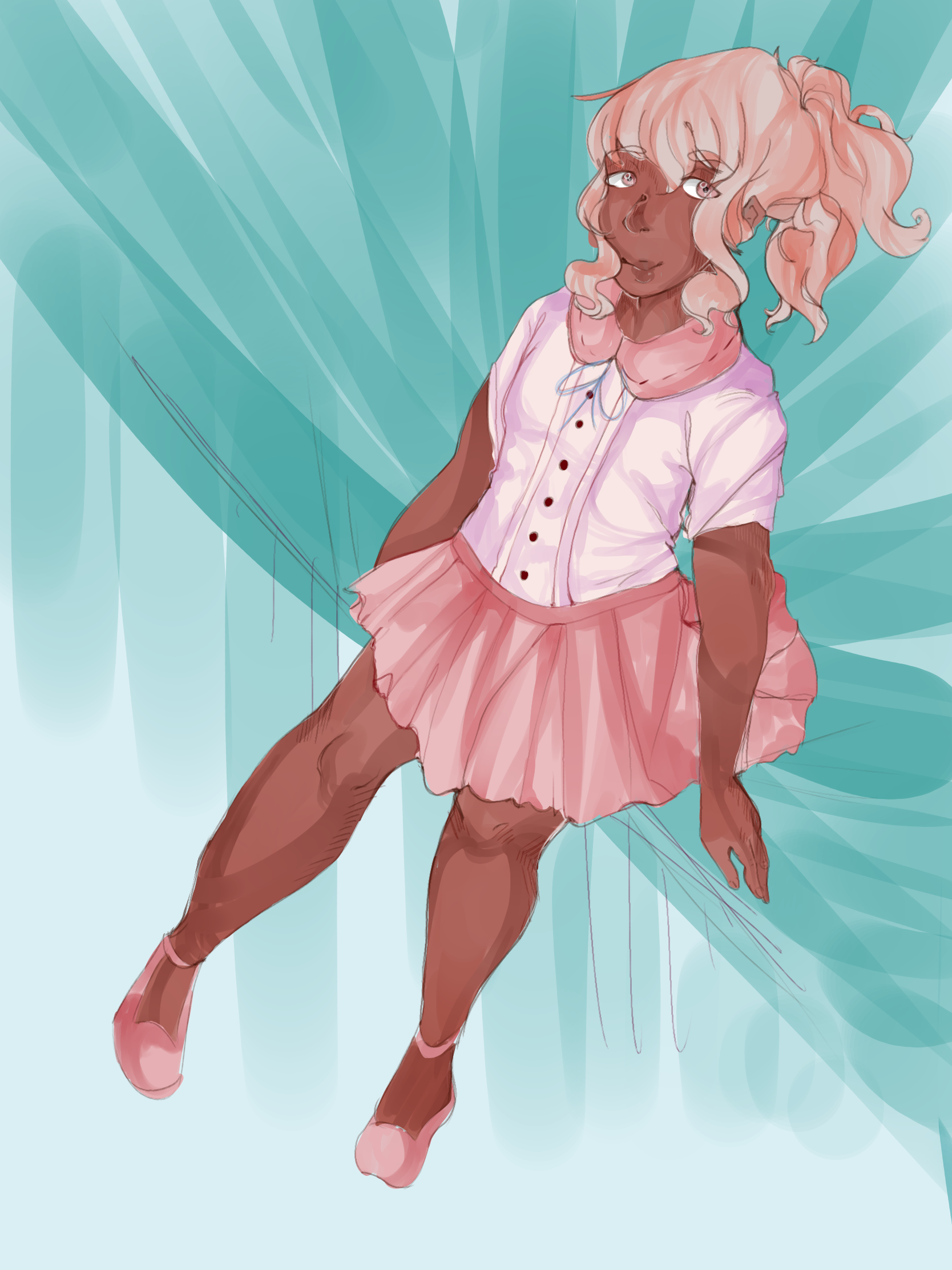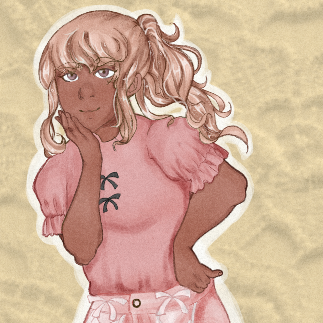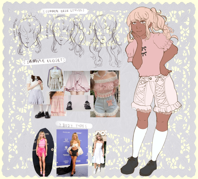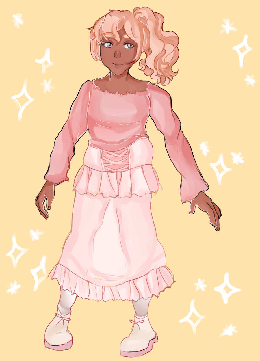 Elodia has dyed rose gold hair that she prefers to wear in a ponytail. Her eyes are a slate gray and Elodia has warm-toned cinnamon skin. Elodia is short for her age. Her sense of style usually consists of pastel colors, ribbons, ruffles, and lace in some capacity.
