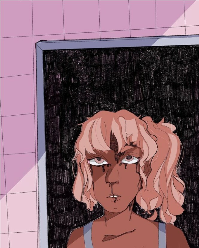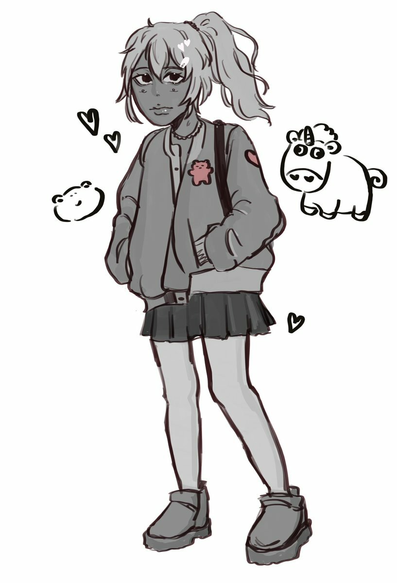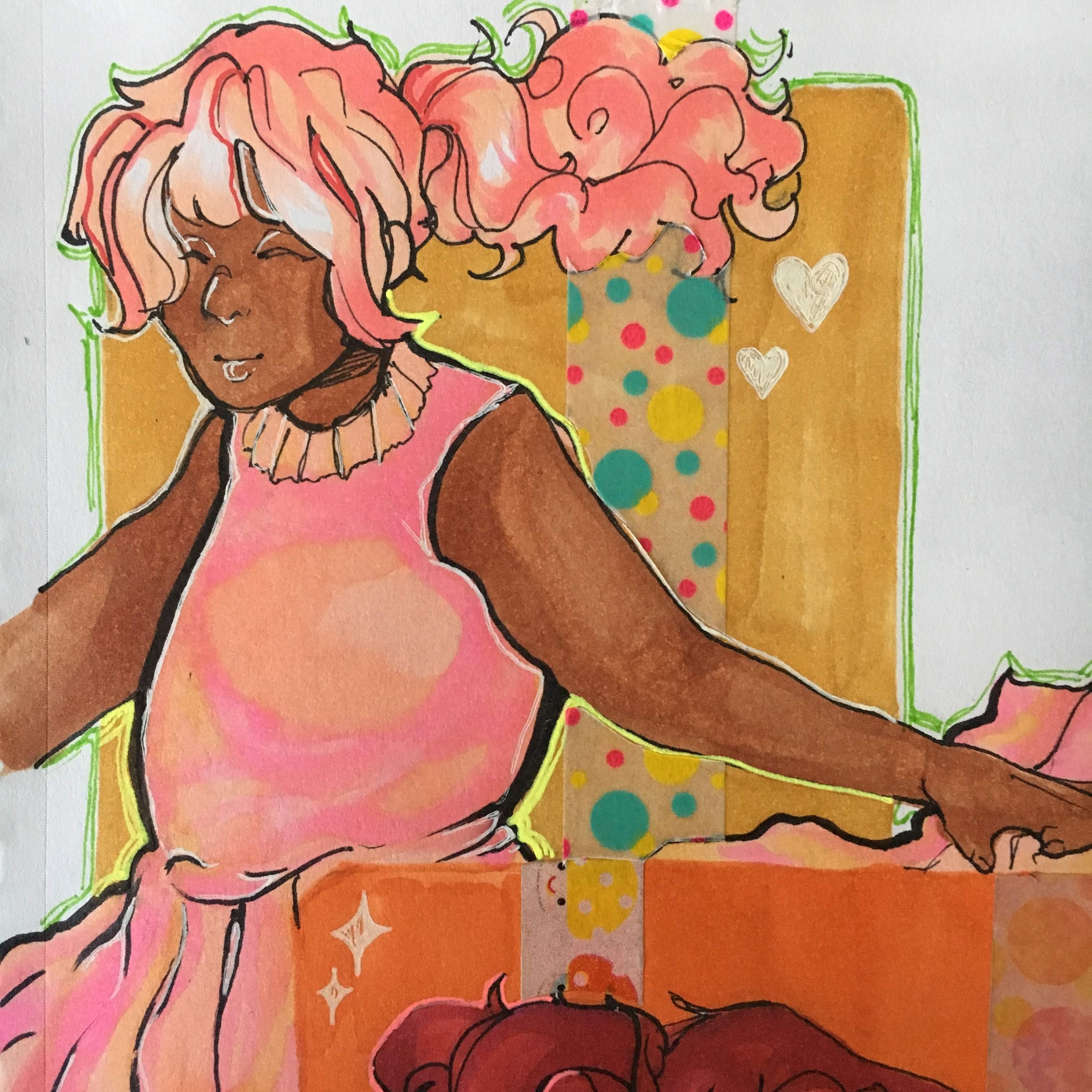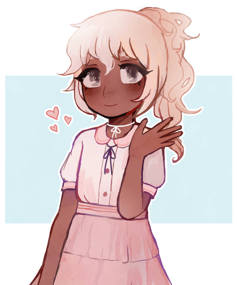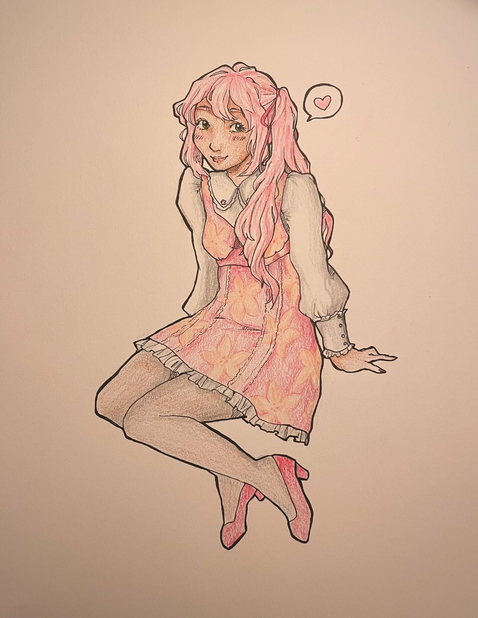 Elodia has dyed rose gold hair that she prefers to wear in a ponytail. Her eyes are a slate gray and Elodia has warm-toned cinnamon skin. Elodia is short for her age. Her sense of style usually consists of pastel colors, ribbons, ruffles, and lace in some capacity.